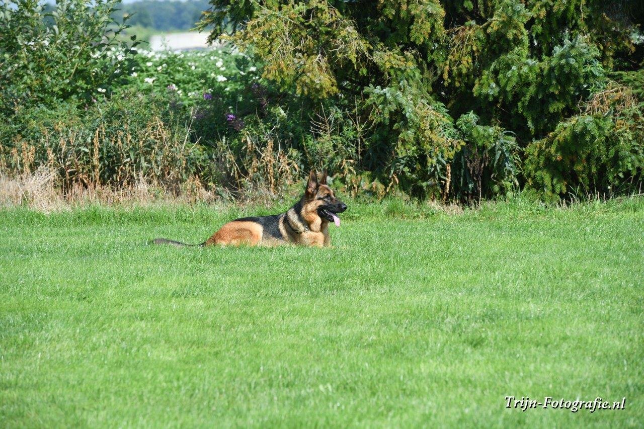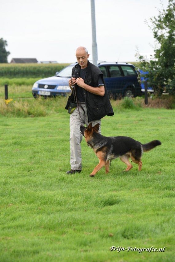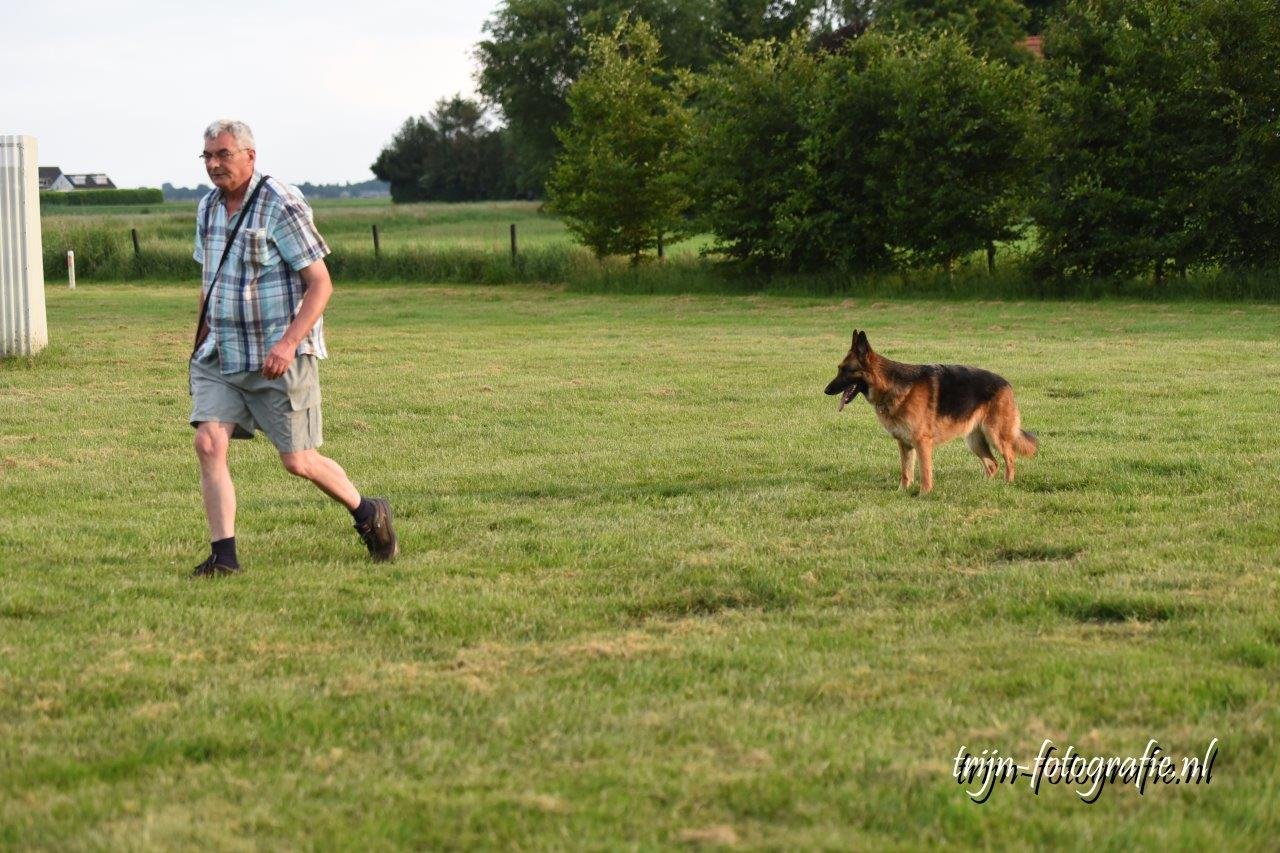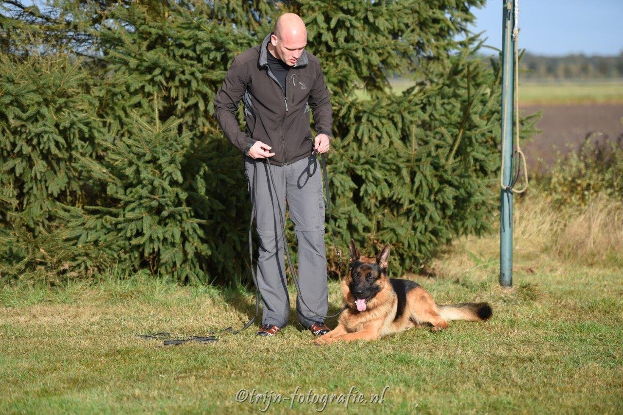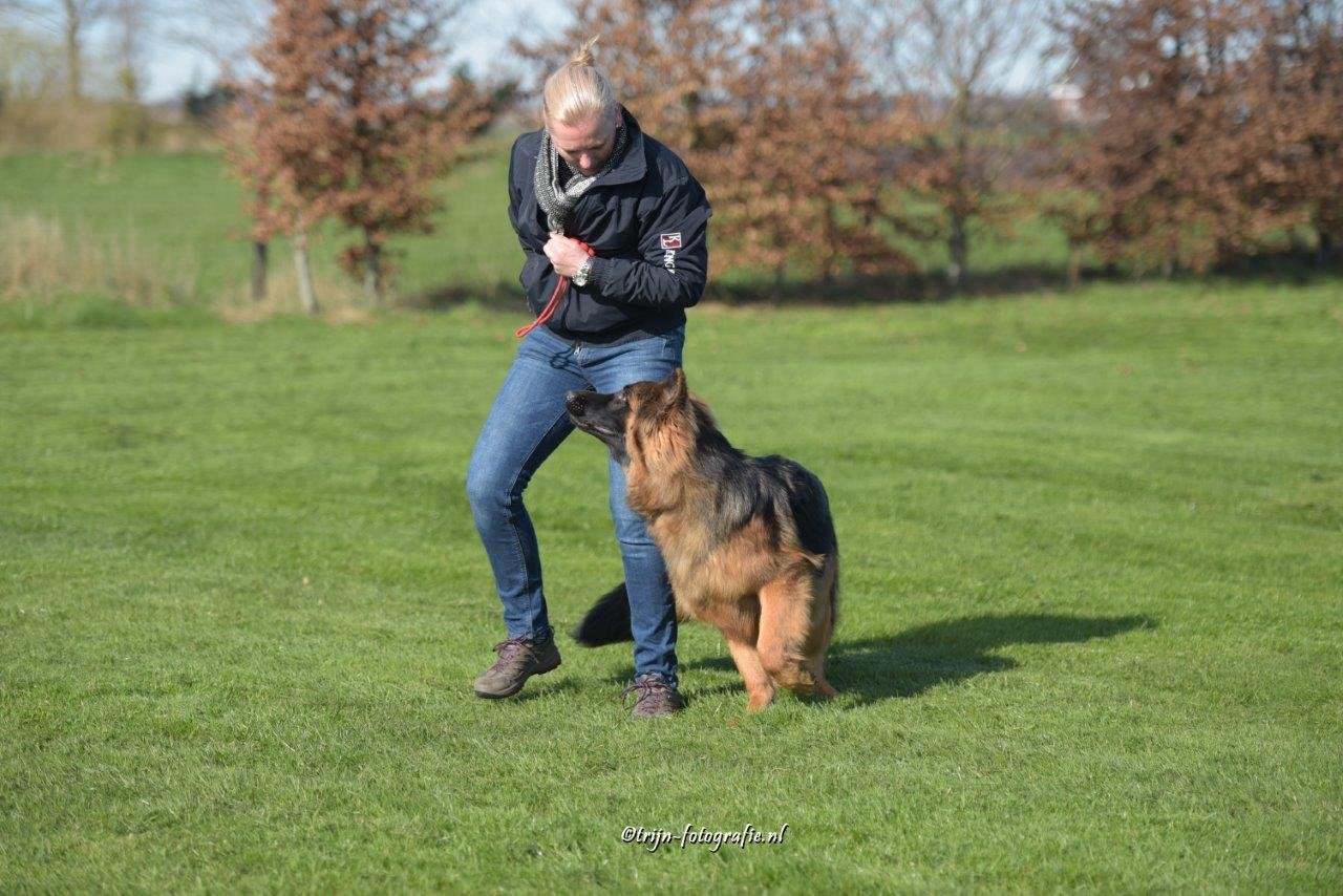 Bij het volgen loopt de hond vrolijk en attent bij de geleider.